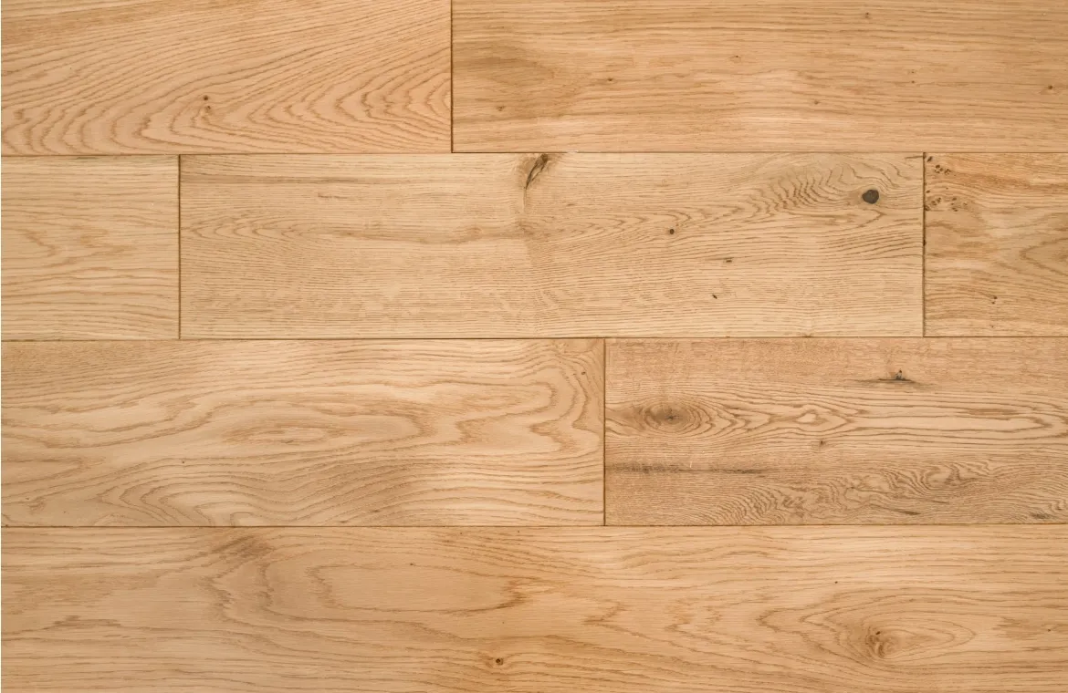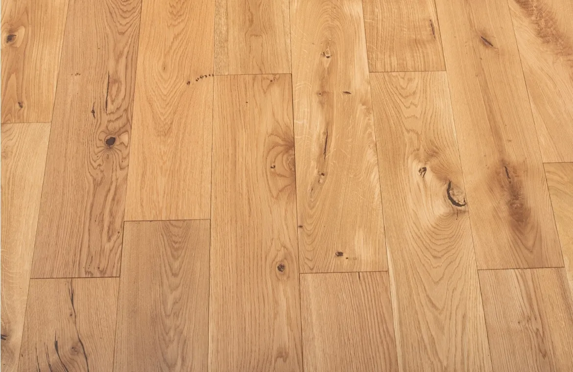 Brimham Farmhouse solid oak flooring with smooth lacquered finish and straight plank style. 18mm thick with 4-sided bevel and tongue & groove. Suitable for nailing or gluing down. Durable solid wood flooring for all rooms except bathrooms.