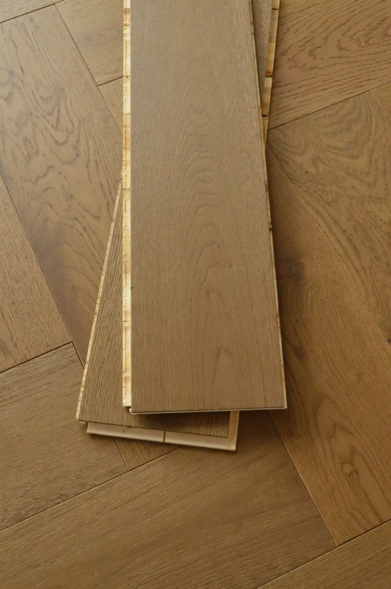 Engineered smoked oak parquet flooring with brushed and oiled finish for a rich, warm tone and textured feel. Each board has a 3mm veneer, refinishable up to three times. Durable, elegant, and ideal for long-lasting parquet flooring in any room.