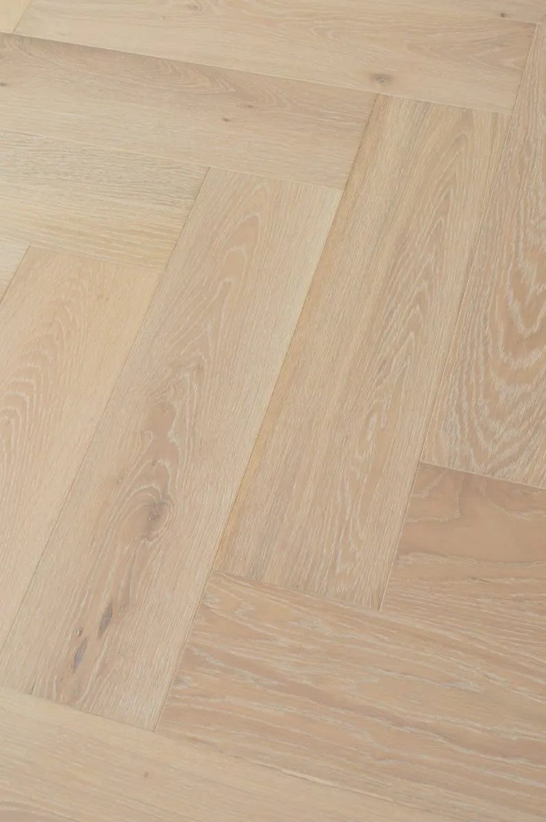 Engineered whitewash oak parquet wood flooring with brushed, matt lacquered finish for a textured, elegant look. Each board has a 3mm veneer for sanding and refinishing up to three times. Adds lasting beauty and luxury to any room.