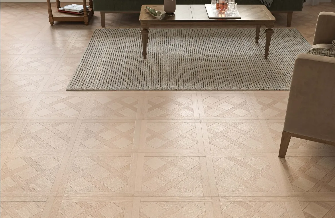Prestige 12mm Jardin Versailles laminate flooring with textured surface and elegant Versailles plank style. Click system for floating floor installation. Compatible with underfloor heating, suitable for all rooms except bathrooms. Durable and stylish flooring for modern and classic interiors.